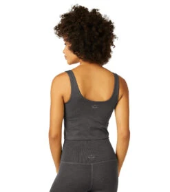 The Beyond Yoga Keep It Simple Heather Rib Cropped Tank is great for layering and boasts a symmetrical, scoop front and back.