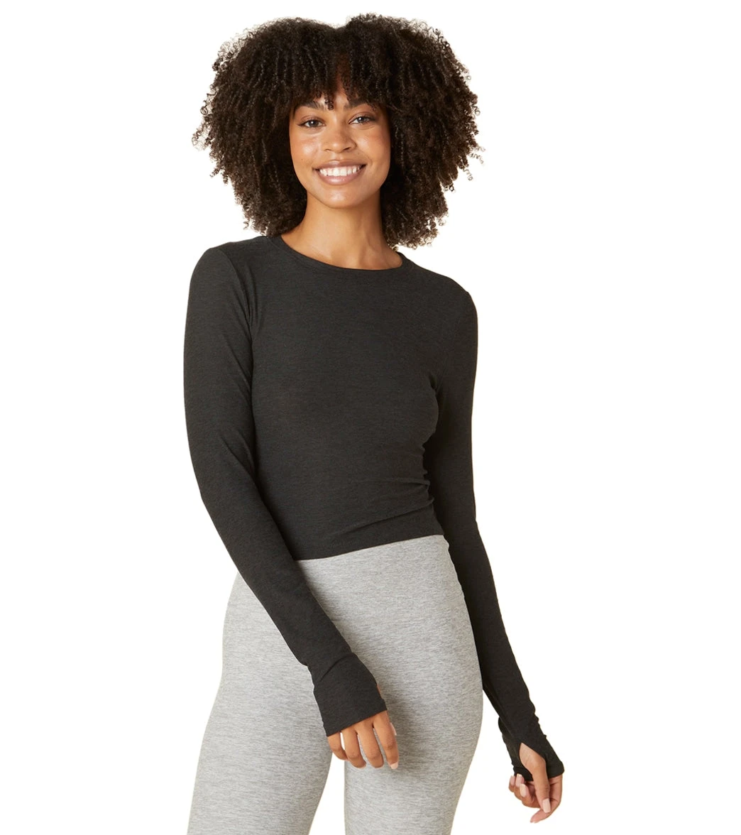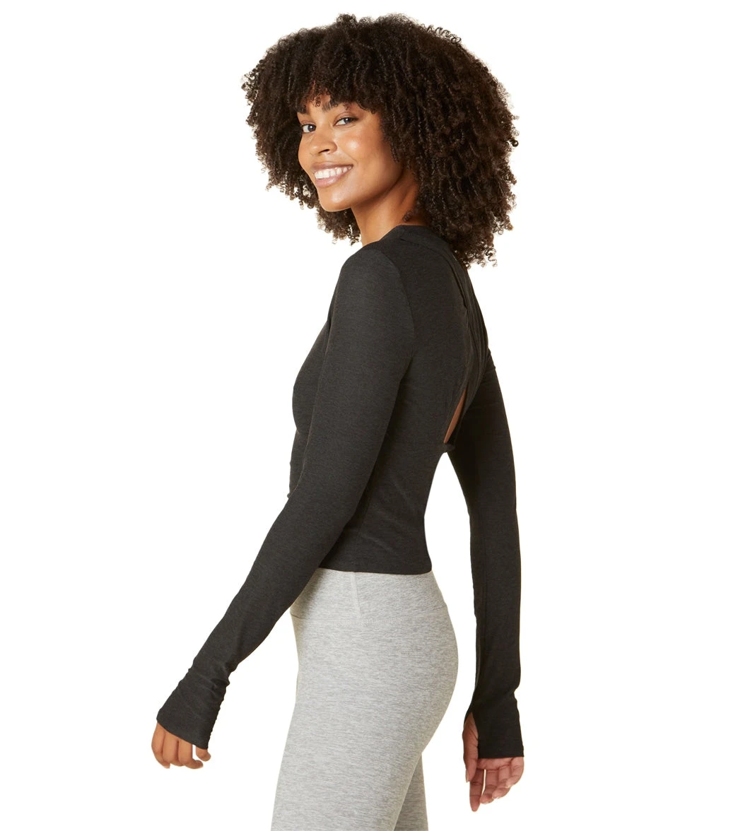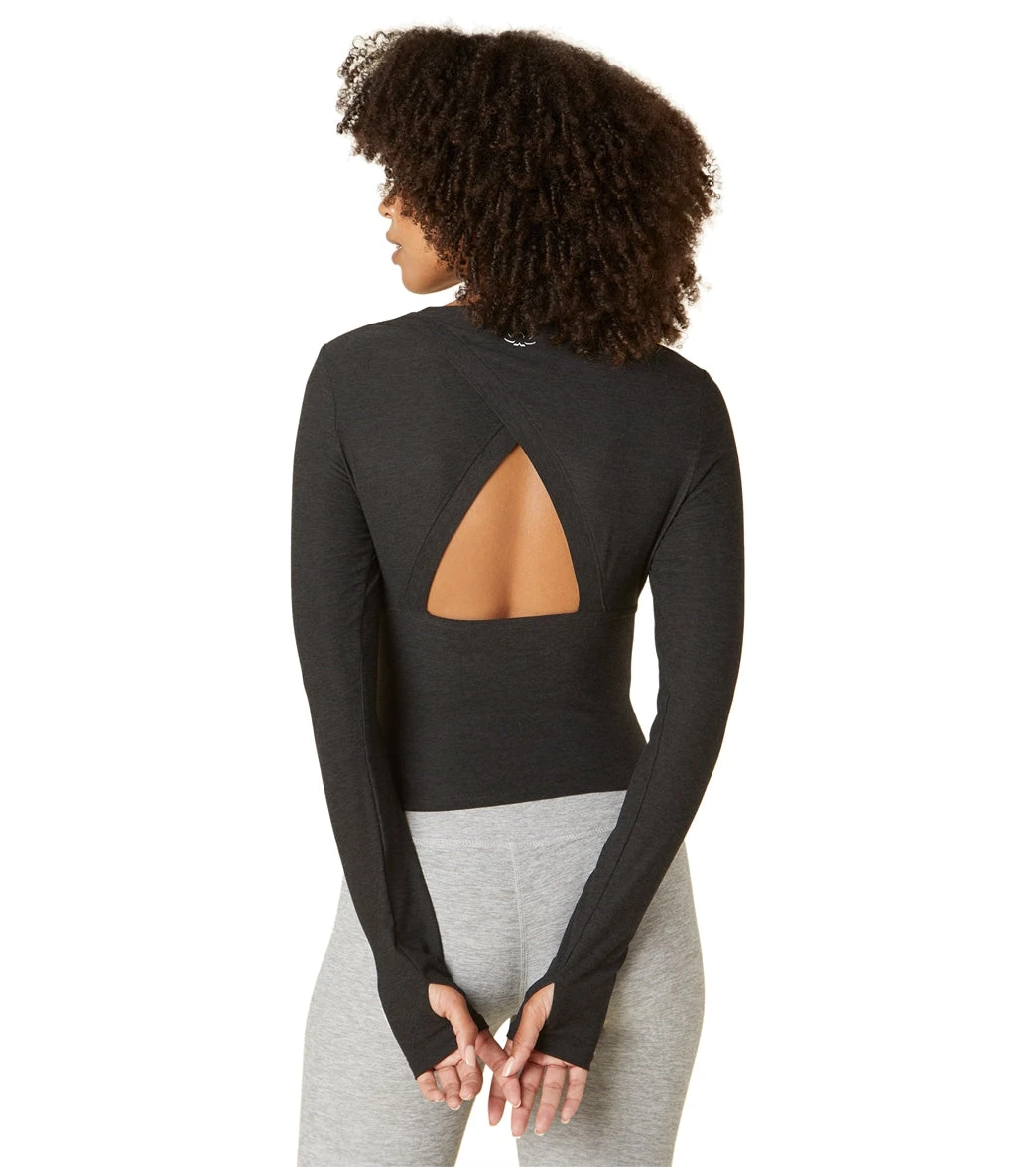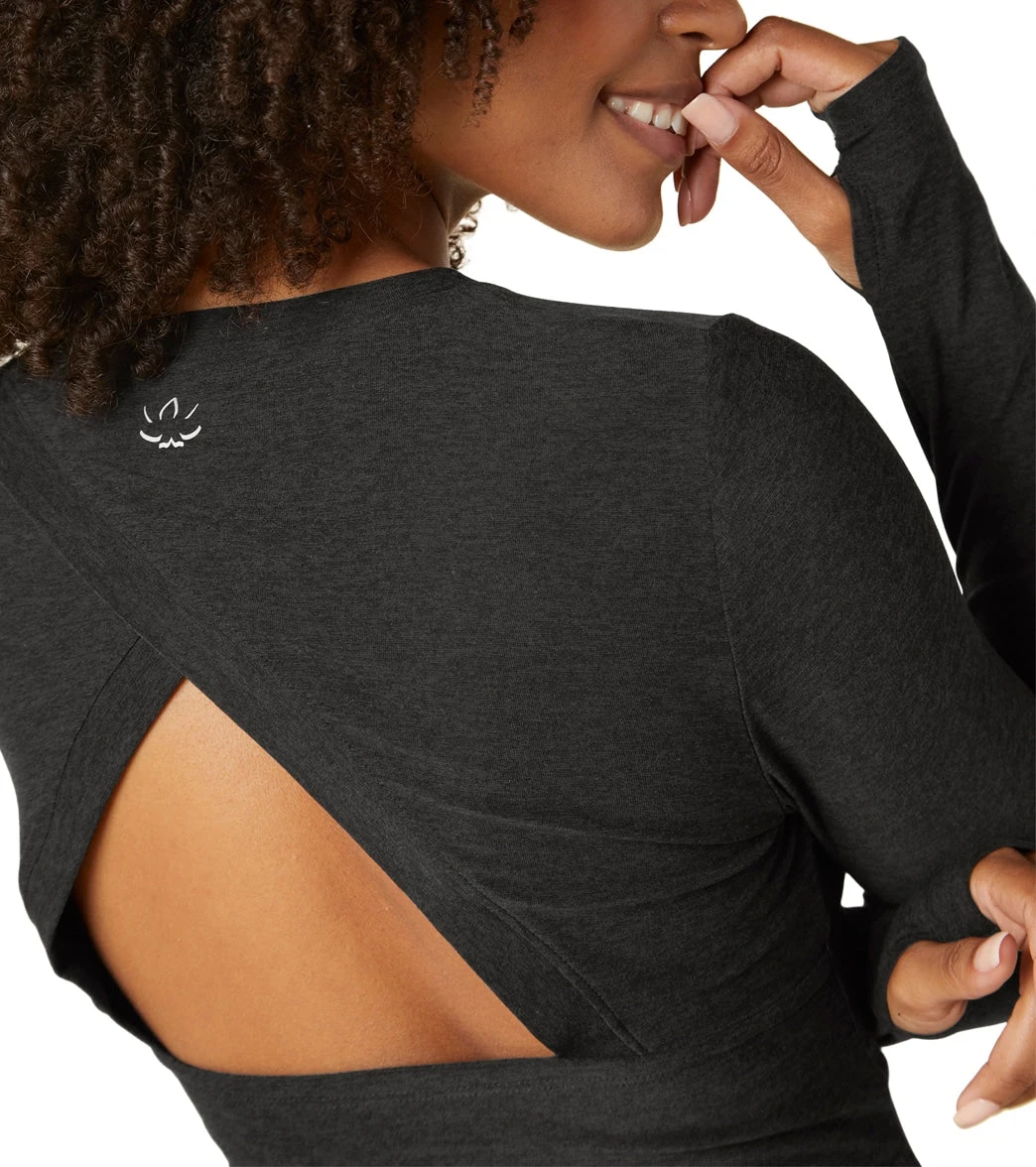 Plans can overlap when you’re wearing the Beyond Yoga Overlap Long Sleeve Cropped Pullover, a stylish choice with a triangle back cutout that will carry you from workout to play.