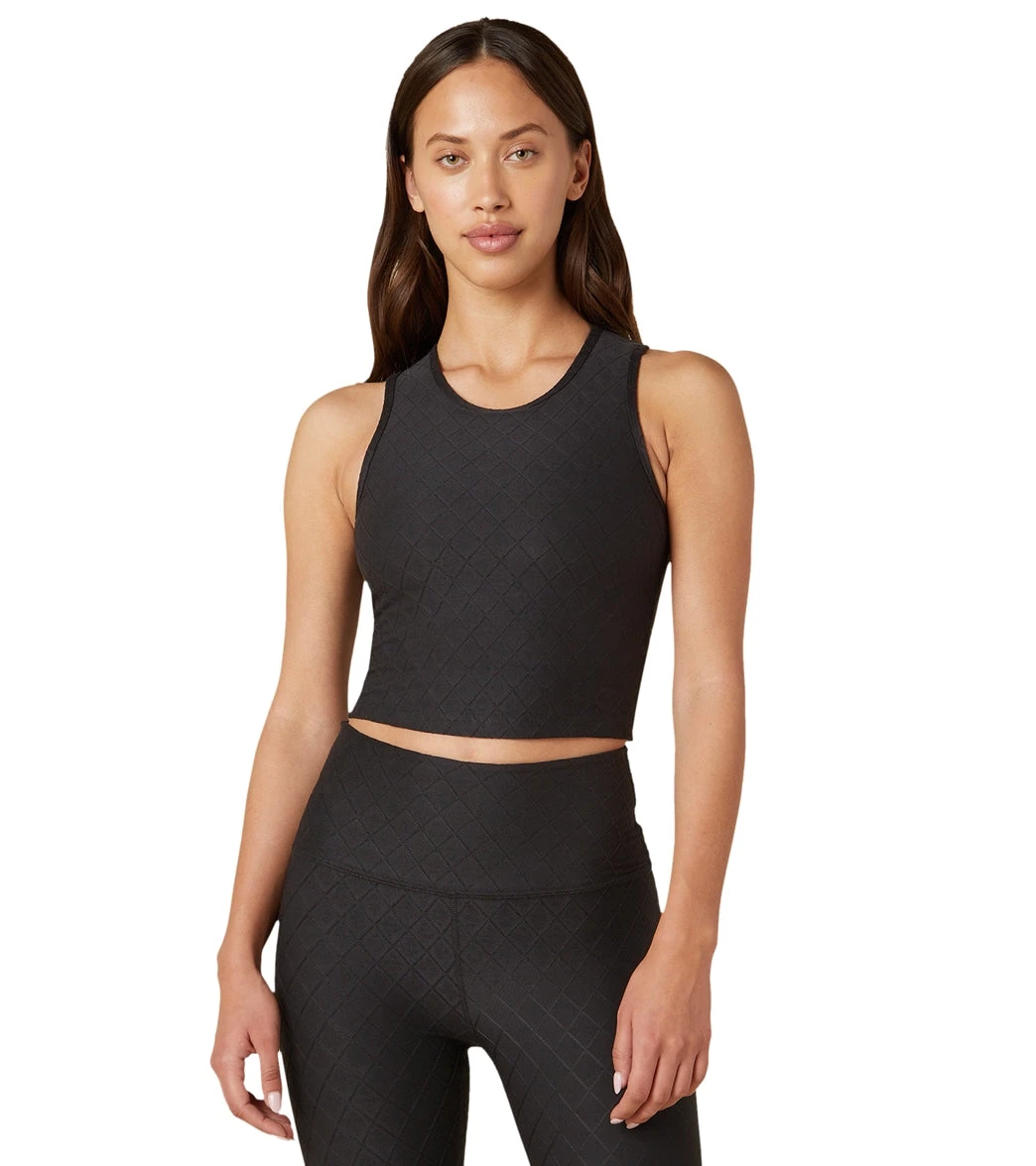 The Beyond Yoga Quilted Cropped Tank features a diamond-pattern texture that is shrink resistant and great for maintaining shape.