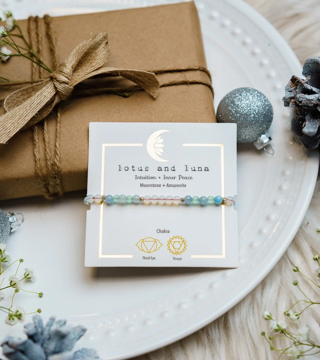 Attuned to the energy of the moon, moonstone is known to stabilize emotions, decrease stress, and enhance intuition, while Amazonite soothes the spirit and calms the soul while promoting clarity and self-love.