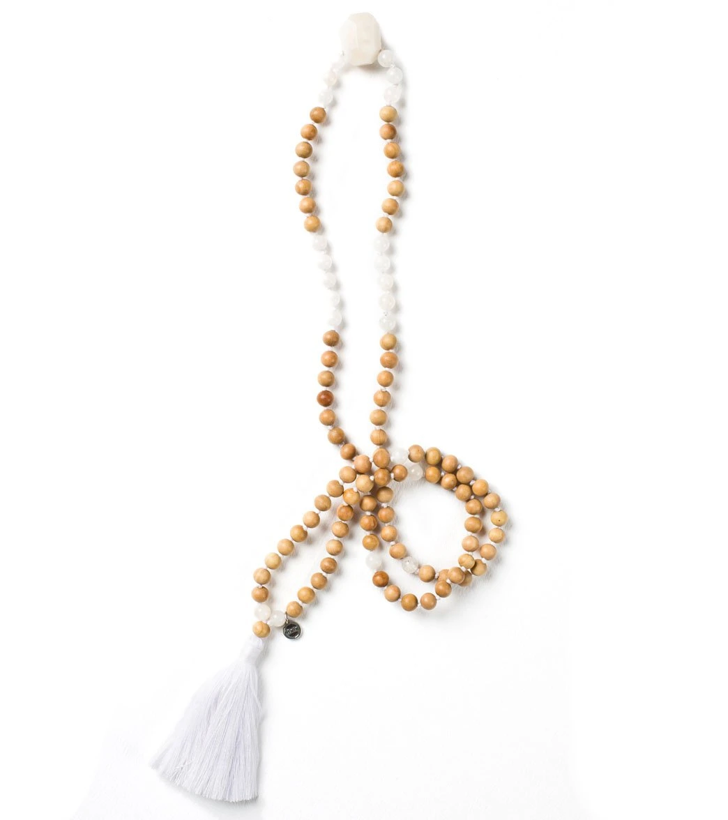 Clear your mind with the Mala Collective Mala Inviting Clarity Japa Mala Necklace. Sandalwood and White Moonstone gemstones provide a combination of calm, tranquil energy that aids your on your journey.