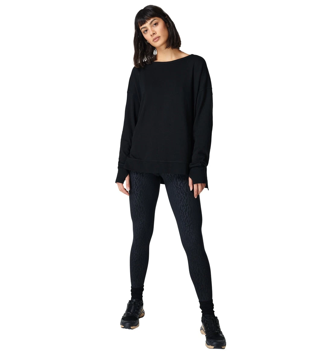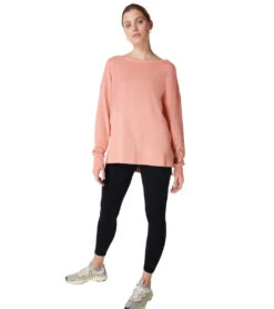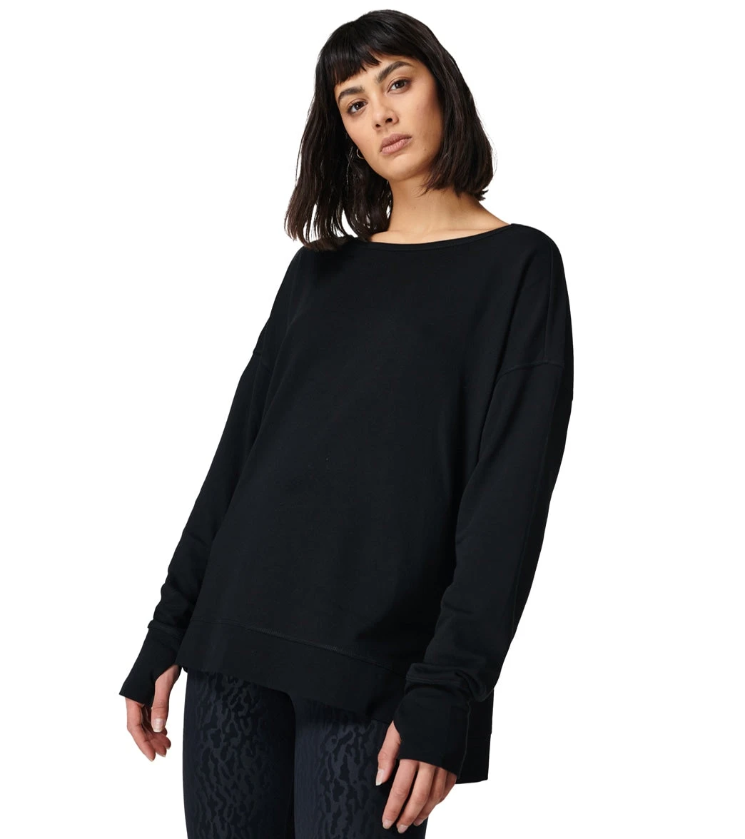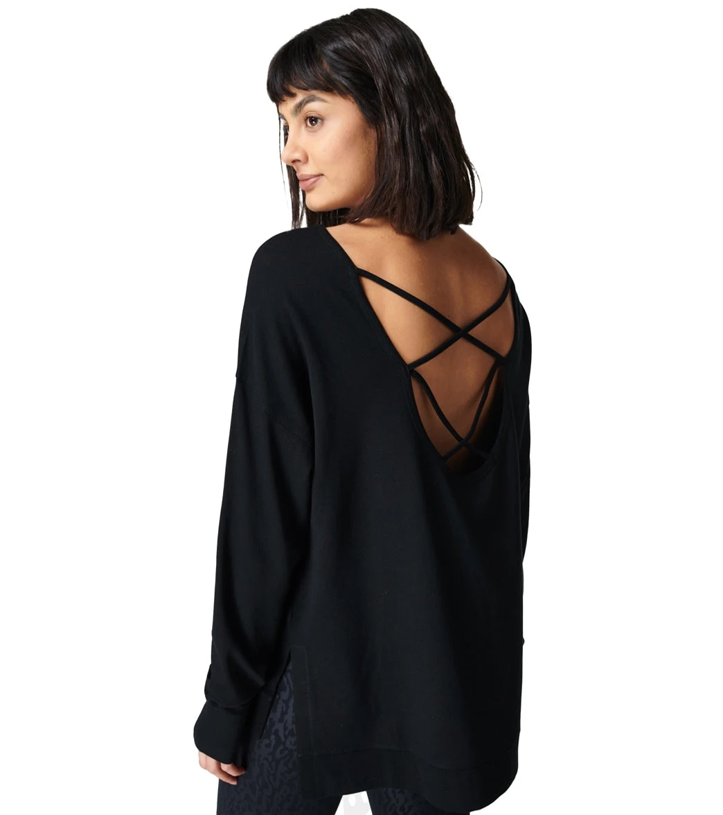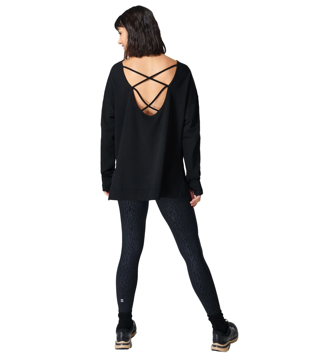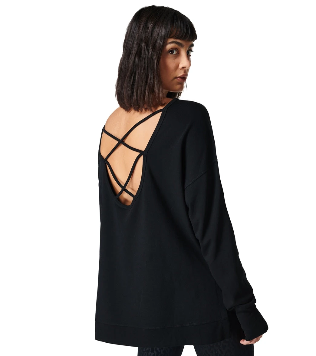 Made from a breathable blend of organic cotton and stretchy modal, the Sweaty Betty After Class Cross Back Sweatshirt features an open crisscross back, bum-covering extended back, and side slits.