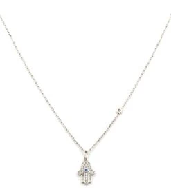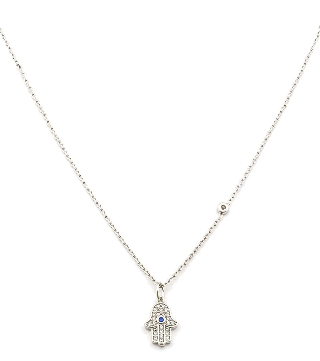 The TAI Jewelry Simple Chain Necklace with CZ Hamsa Charm and CZ accent is a dainty bauble that adds a touch of sparkle to any outfit and is great for layering.