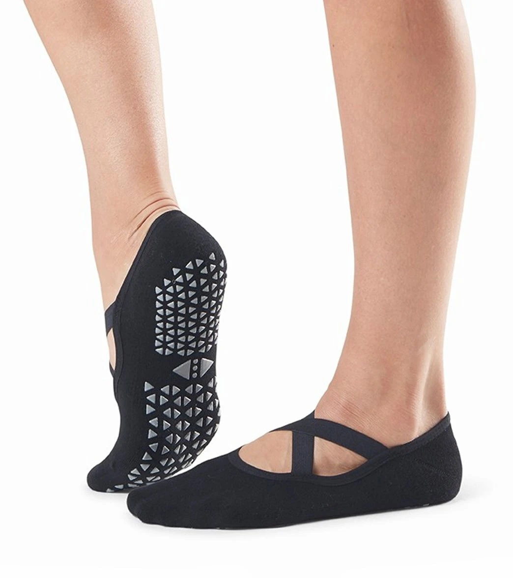 From yoga to barre, these Tavi Chloe Barre Grip Socks provide ultimate grip from the arch of the foot down to the sole. Top crisscross elastic straps keep sock in place while a high-density rubber grip sole keeps your footing in place as you move.