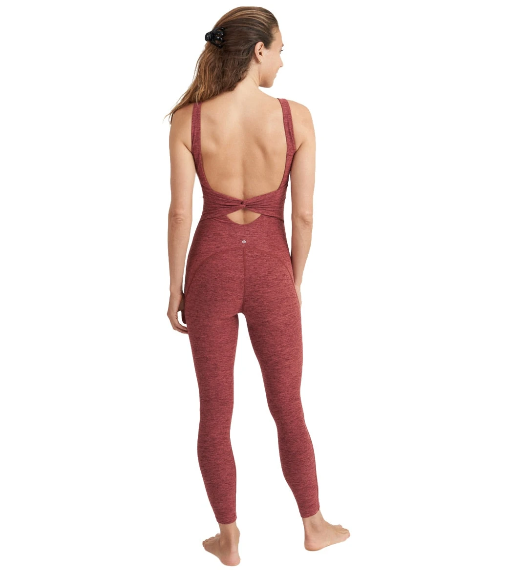 The Thrive Societe Twist Back Onesie features a scoop neck and plunging back with twist detail and a cutout. Its 7/8 length hits just above the ankle, and the garment comes with removable cups for adjustable coverage. It is crafted from heather compression fabric with a brushed hand, providing light compression for light-impact workouts.